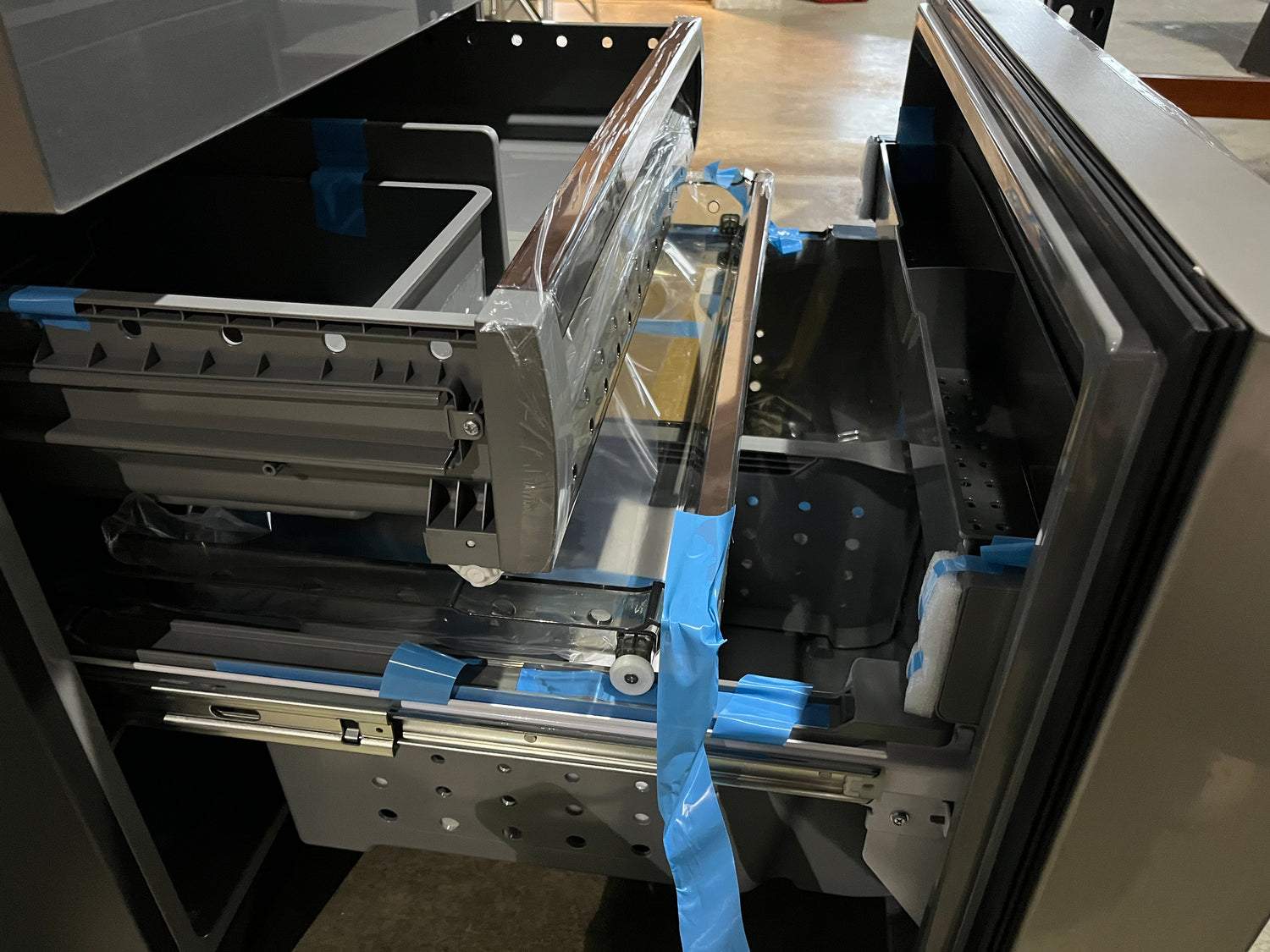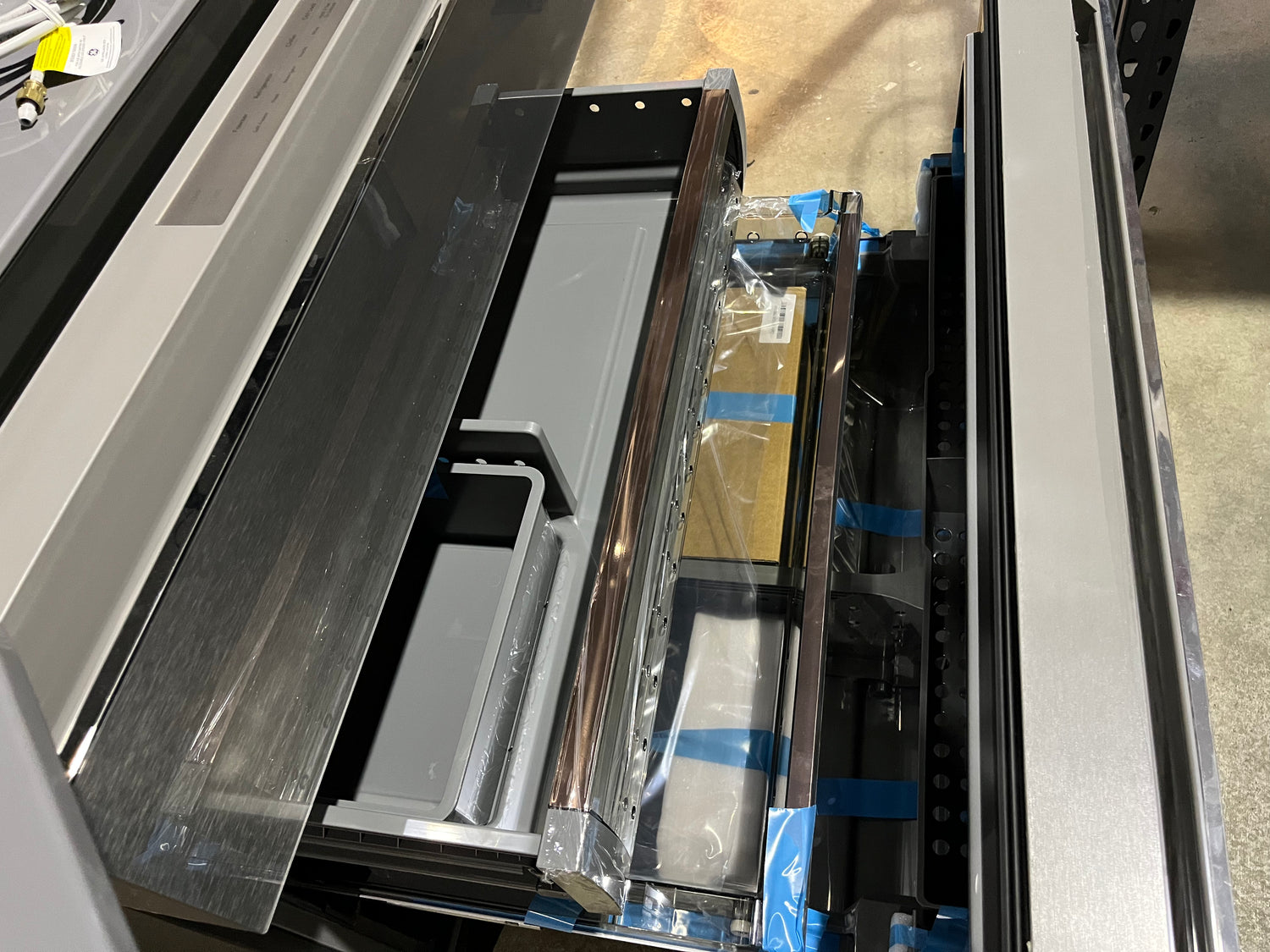 This stylish refrigerator convertible drawer features glass dividers for a clean, aesthetic storage solution that allows for simplified organization.